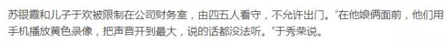 吴学占让手下拉屎,并将苏银霞按进马桶里,要求还钱。案发当天,苏银霞和于欢母子被关在了一起。“什么话难听他骂什么,没有钱你去卖,一次一百,我给你八十。学着唤狗的样子喊小孩,让孩子喊他爹。”杜志浩脱下于欢的鞋子,捂在苏银霞的嘴上。杜志浩脱下裤子,一只脚踩在沙发上,用极端手段污辱苏银霞。一个小时后,失控的于欢,抄起水果刀疯狂捅向逼债者,结果四人中刀,其中杜志浩失血过多死亡。